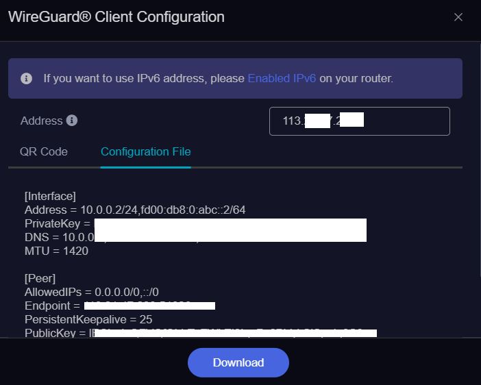 1. Repeat the previous step, however, this time instead of downloading the QR code, whilst still within the Wireguard Client Configuration section on the Wireguard Server, click 'Configuration File' and then select 'Download'