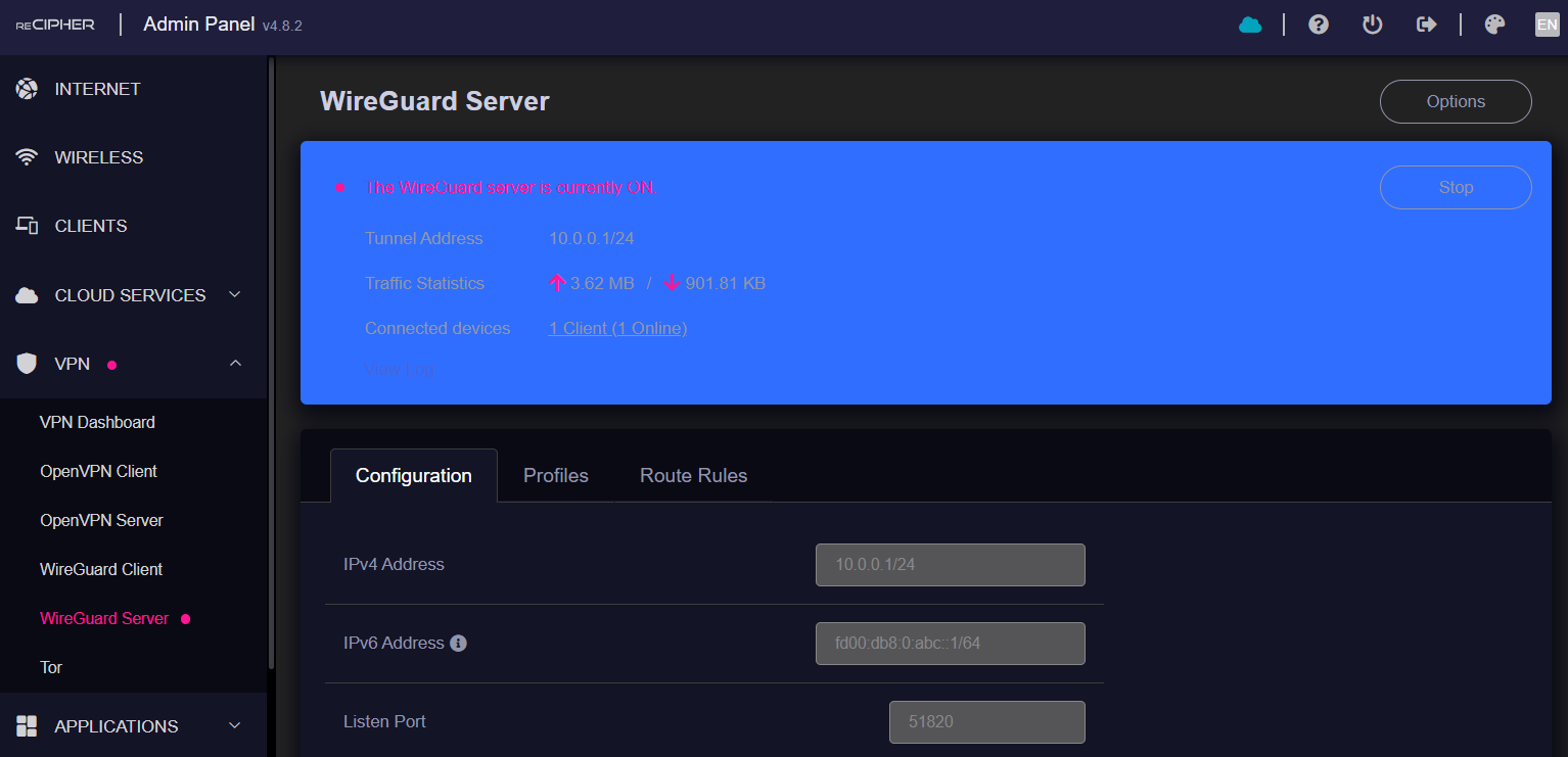 2. Finally, Start the VPN SERVER by selecting 'VPN', 'Wireguard Server', 'Start'