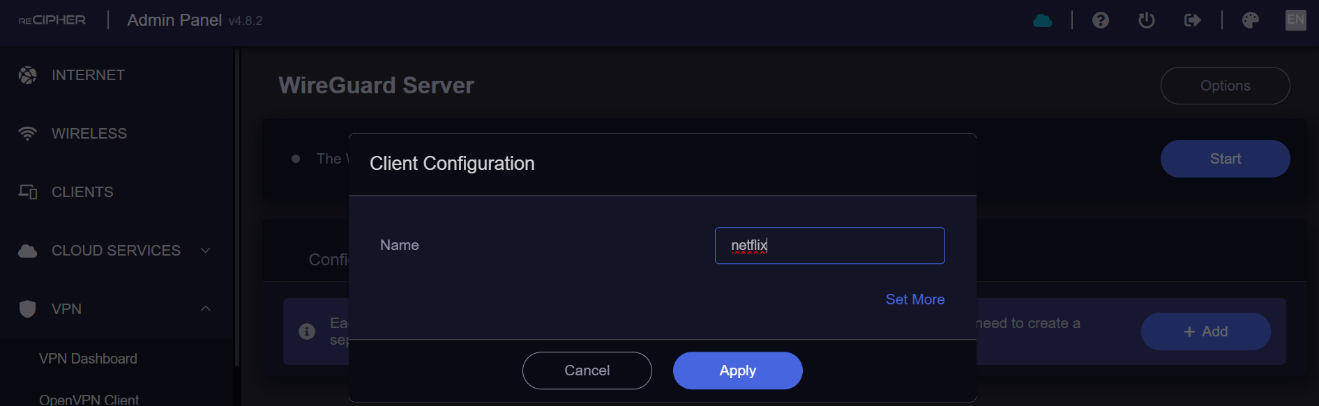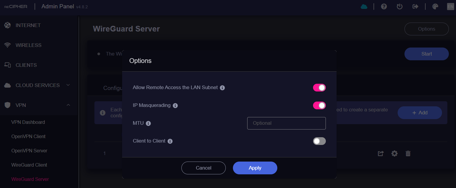 1. Click Apply and then proceed to Start the Wireguard VPN Server